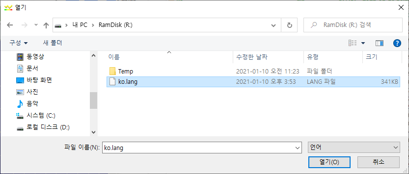 3) 언어 파일 선택(한국어 파일)