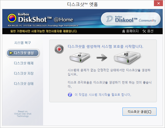 Step 2 - 디스크샷™ 프로그램을 설치하고 '보호막(디스크샷)을 생성' 합니다.