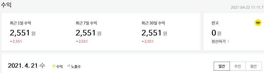 2021년 4월 22일 오후에 수익 창출을 확인해 보면,